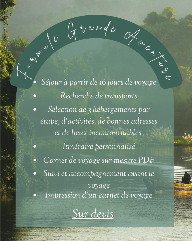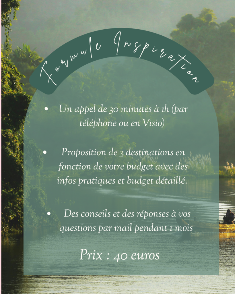 Après validation de votre projet et réception du règlement d’un premier acompte, je vous transmets, dans un délai de une à deux semaines (variable selon la complexité du voyage souhaité). Les liens de réservations pour les transports, une sélection de trois hébergements (par étape si nécessaire), des suggestions d’activités à réserver dans les plus brefs délais.
