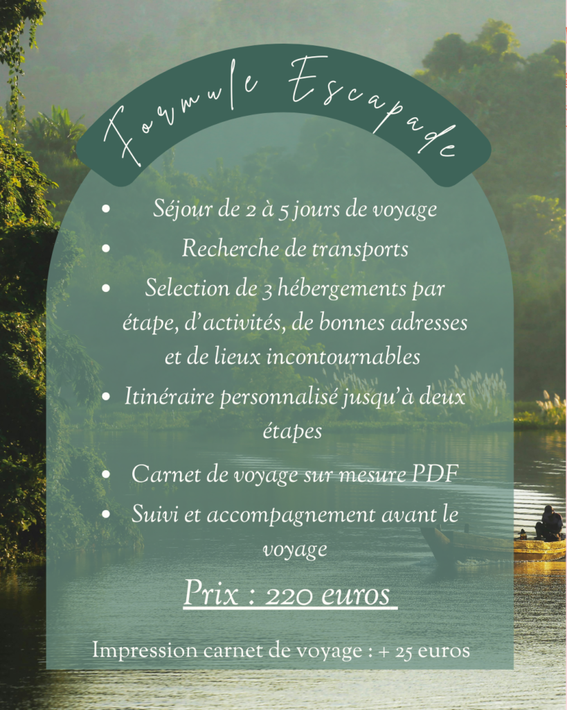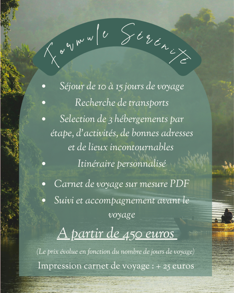 Après avoir effectué mes recherches et réalisé votre itinéraire, je vous remets votre carnet de voyages 100% personnalisé sous format PDF et sous écrit moyennant un supplément.